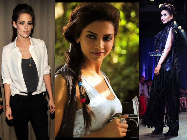 Deepika has plaited her long hair after making a beehive with the front portion of her hair. This is a typically hippie style of the 70's and still in for an 'on the road' look.