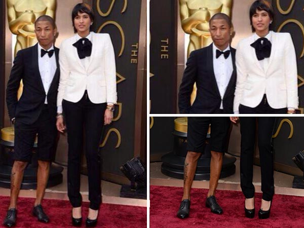 Pharrell Williams wearing his standard fashion style, black designer Lanvin tux shorts, white shirt and a black bow, he did look spruce in this attire. What we loved the most is the way his wife, Helen Lasichanh stood beside taller than him all proud, pretending to be manly and looking down on him with care and support. Helen Lasichanh, on the other hand, wore a white jacket, black sleek trousers and black louboutin pumps to complete her look at the Oscars 2014 red carpet.