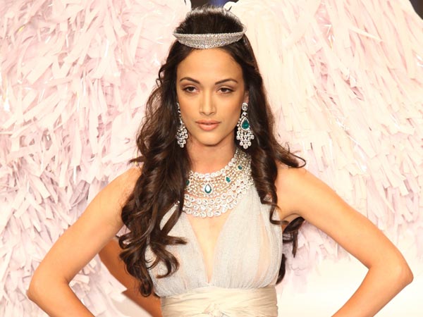 Model Angela Johnson had the most dramatic look of the evening as she walked for Gehna Jewellers. She dressed up like a real angel complete with the halo and white wings. Her dress too was a pearly white. Angela Johnson displayed jewellery designs that symbolise angelic beauty. Her necklace and earrings were made of diamonds with a centrepiece of emeralds. She wore a very sleek tiara of white metal and a bracelet of matte gold.