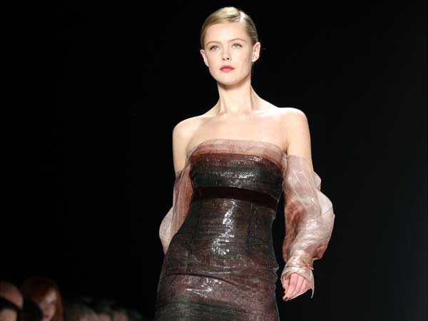 This is a very interesting wrap-a-round dress. The gown is a sheer but the material has a glazed finish. It almost looks like wraps of polyester. The fabric is shaded with different colours like black, skin tone and peach. The model here looks wrapped up like a mummy from the top but the skirt of the dress has a wide hem. The sleeves are off-shoulders leaving the shoulders bare for dramatic effect!