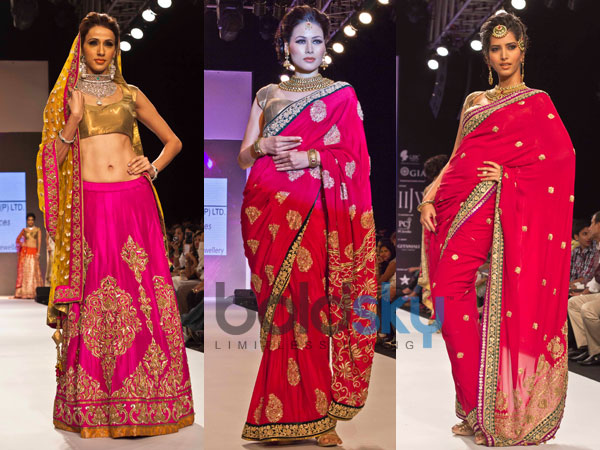 Most of the bridal jewellery we say on Day 4 of IIJW 2013 was heavy and yet very wearable. If you are looking to select bridal jewellery for yourself, you can certainly make use of these sample designs. The models were all dressed in bright rani colour and red coloured lehenga cholis. The entire ambiance of the stage looked classically bridal.