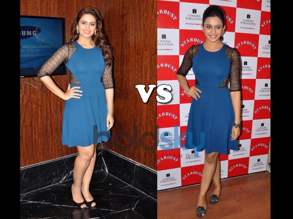 Both Huma Qureshi and new bee Rakul Preet were spotted in a ditto dress recently. The actresses were seen wearing a ditto dress from French Connection at differnert events.