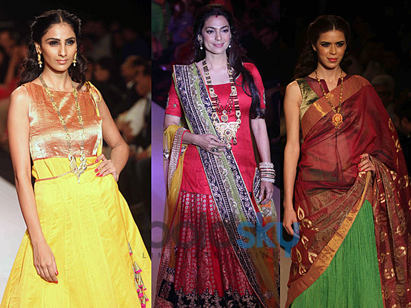 After that, some really ornate mangalsutras were displayed on the ramp of IIJW 2013. These were all gold mangalsutras that were too heavy and traditional. But thankfully, we also saw some brilliant diamond mangalsutras that would suit the tastes of the modern Indian women. The showstopper for Shringar was Juhi Chawla. She displayed one of the heaviest pieces of mangalsutras at IIJW 2013.