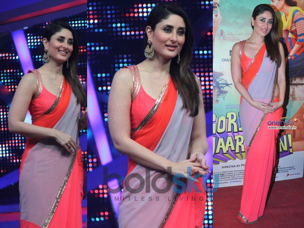 Kareena Kapoor looks gorgeous in whatever she wears. Be it the traditional saree or body con dresses, Bebo looks great in everything. The stylish diva was recently spotted on the sets of Nach Baliye 6 where she was promoting her upcoming film, Gori Tere Pyar Mein. The actress looked breathtakingly sexy in a neon coloured saree. Off lately, Kareena Kapoor has been promoting her upcoming movie. We have seen her in different outfits; from patialas to lace knee-length dresses. However, this coral coloured saree has just impressed us!
