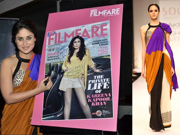 Kareena Kapoor Khan was recently seen at the unveiling ceremony of the latest Filmfare issue cover. She is gracing the cover of Filmfare magazine this month and was thus called to unveil the issue. Kareena Kapoor wore a saree that was vibrant and colourful. For one moment, we were confused by the bold block prints that reminded us a bit of Masaba Gupta's couture.