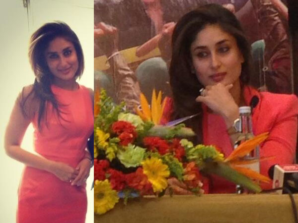Here are some images of Kareena Kapoor in her coral coloured Paule Ka dress and some more images from the Satyagraha trailer launch.