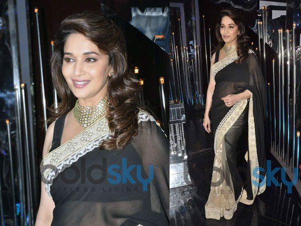 Madhuri wore this designer saree with a plain black sleeveless blouse.
