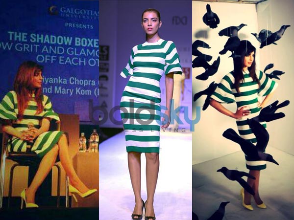 Priyanka Chopra is looking drop dead gorgeous in this chic look. The Bollywood beauty is seen wearing on a striped green body con knee length dress by Gauri and Nainika. The dress was also worn on the runway!