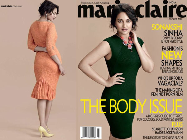 Sonakshi Sinha is on the Marie Claire cover of July 2013 magazine. And guess what the cover story is? Along with Sonakshi Sinha, the Marie Claire cover page carries the tag line 'The Body Issue'. The topic is a burning hot discussion in Bollywood. Should women embrace the curves of their body or strive to get a size zero?