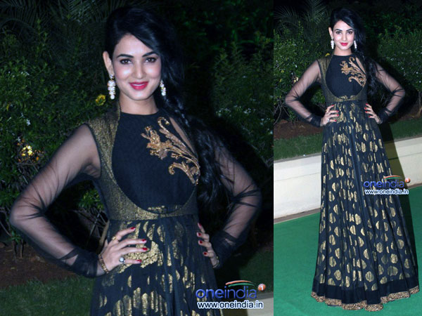 Sonal Chauhan wore the bold colour black which had hues of golden on it. It was an anarkali gown which had golden work and print all over it. The frilly black and golden anarkali gown looked like a silhouette. As Sonal Chauhan is tall, she carried off the silhouette to perfection.