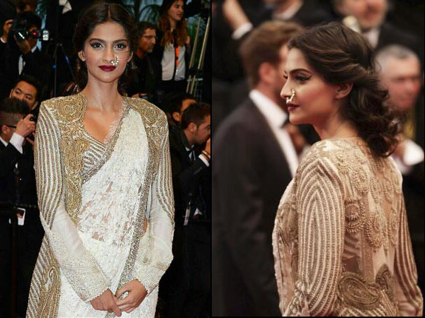 Cannes 2013 opened with the screening of The Great Gatsby. Sonam Kapoor wore a saree to this much waited screening. The saree that Sonam Kapoor wore was from Anamika Khanna's couture. It was a white lace saree that was worn with a shimmering white golden blouse. Over the saree, Sonam wore a long shrug like jacket. The train of the jacket trailed behind her giving the ensemble a gown like appearance.