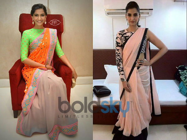 Here is a closer look at Sonam Kapoor in sarees from two new designers on the block.