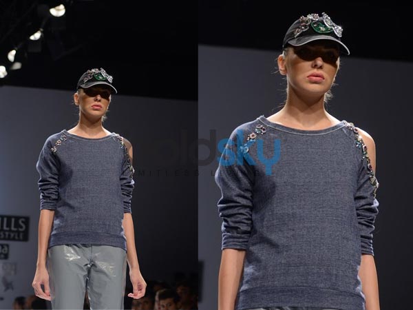 Sanchita presented a funky and sporty collection at the Day 3 of WIFW SS 2014. The collection had latex outfits in vivid colours. Models carried the sporty look. From short skirts to hot pants, we saw some creative style for the sports women!