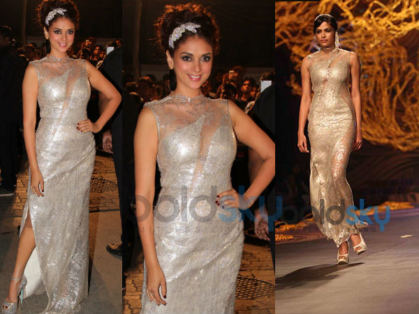Aditi Rao Hydari stunned at the red carpet of Filmfare Awards 2014. The angel looking actress wore a sheer silver coloured sequinned gown. The gown was showcased at the Indian Bridal Fashion Week 2013 ramp by the ace designer.