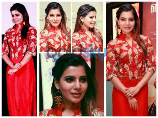 Carrying this elegant red hot attire with a smile, Samantha looked extremely sensational. At the event, the red embroidered Anamika Khanna outfit stood out against the light. The intricate work on the outfit was pleasing to the eyes. At one glance on the outfit, we were convinced that it was top heavy, since she found it a little uncomfortable.