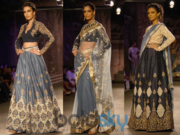 First of all; the colour palette of Anju Modi's collection was a definite change from the ongoing trends. Orange and coral are really hot on the fashion metre now. We see a definite shift towards blue, gold and yellow. At the India Couture Week 2014 last night, we also saw some other fashion trends like Mughal shawls and sheer drapes.