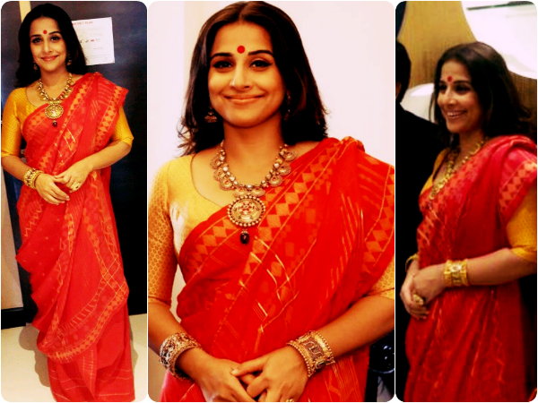 The thread-work in the red saree was mainly yellow, so Vidya paired up the saree with a yellow coloured blouse. The saree was draped in the typical Bengali style without pleats. And as Vidya Balan was in Kolkata for the launch of jewellery store, she wore tons of gold jewellery. The jewellery designs were very quintessentially Bengali. Vidya wore heavy coin necklace with 'dheri' jhumkas and 'chur' or thick golden bracelets in her hands.