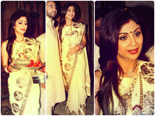Shilpa Shetty was also attending the festivities at Anil Kapoor's house. She wore a pale yellow saree that was embellished with gota and golden embroidery. This saree was draped over a sleeveless silk blouse with a square neck. We don't quite like the overdose of jewellery. She could have skipped the long necklace.