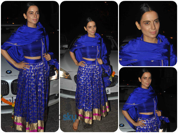 When we saw Kangana Ranaut our jaws dropped. The nude makeup and bright outfit was a good combination. Wearing a cobalt lehenga, heavy with gold and neon pink detailing Kangana was the center of attention at Aamir Khan's Diwali bash. Push back gelled in hair and a simple bindi completed her Diwali style.