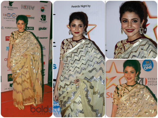 Diva Anushka Sharma also opted for a Abu Jani Sandeep Khosla saree. With her hair in an updo, the actress finished her look with an oxblood lip, chandbalis, a cocktail ring and matching glittery peep-toes. Anushka's saree too was heavily embellished with silver and gold detailing.
