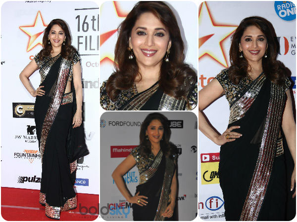 As mentioned earlier, Madhuri Dixit looked hot. Wearing an Abu Jani Sandeep Khosla saree, Madhuri glittered. The black and silver saree on her perfect figure was enticing to the eyes. She carried it off well by completing her look with big earrings and a cocktail ring.