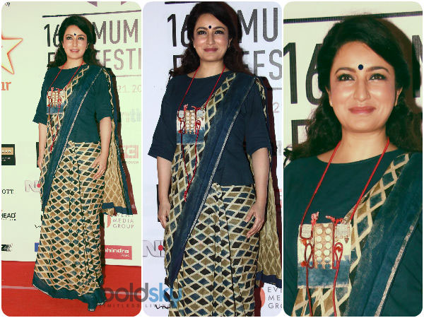 Keeping it traditional, Tisca Chopra attended the closing ceremony of Mumbai Film Festival 2014 wearing a saree by designer Anavila. She kept her hair half-up which looked unprofessional. Tisca finished off her look with a big matching bindi. It was the conceptual jewellery by Anavila Misra.