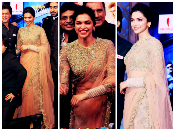 Deepika pulled her hair back into a neat bun and did tasteful makeup. She used minimal eye makeup and painted her lips a light tint of coral. Tiny diamond studs in her ears was the only jewellery she decided to wear. She wore flat footwear as usual with the saree. But there was still something not quite right about Deepika Padukone's look at the music launch of 'Happy New Year'.