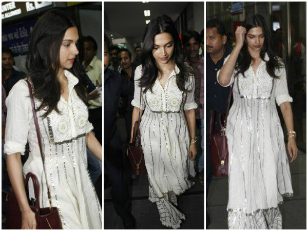 Deepika's attire was beautiful and not to forget, she styled it exquisitely too. Blushed lips, silver jhootis and her favourite Tom Ford bag wrapped up this airport style.