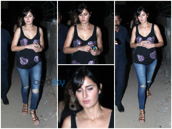 The actress sported a sans makeup look and was dressed casually in blue jeans and a black vest. Katrina plunging neckline was a sight not to miss. Carrying this casual look for a birthday party, she looked quite stylish. The black vest top Katrina wore was embellished with purple and pink sequins in the shape of a heart. To this, she matched a pair of red sandals, which were kind of old-fashioned.