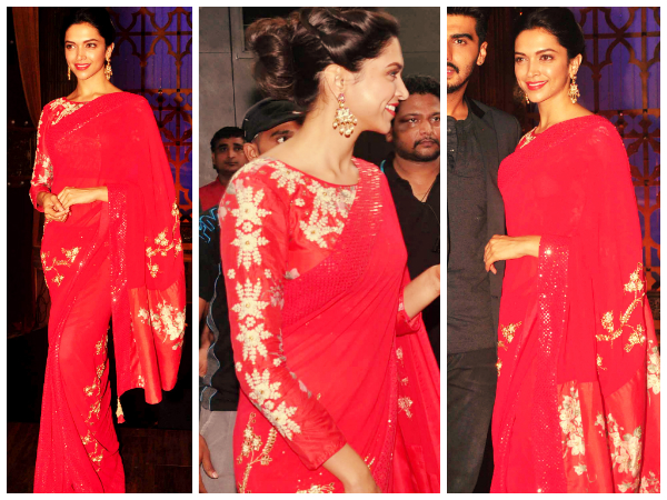 Deepika Pdukone looked smashing hot in this red saree from the fashion label Nikasha.