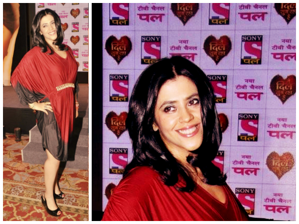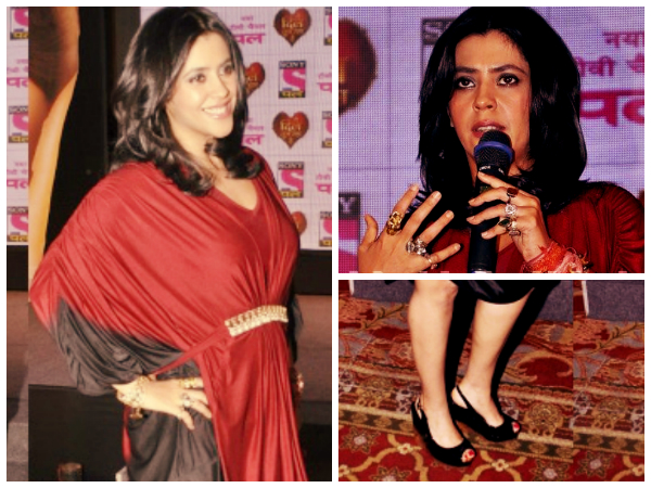 At the launch of the TV show Ekta Kapoor carried herself with poise. Wearing a maroon and black kaftan short dress, she wore plenty of accessories to keep up the style. Peep toe wedges completed her new dress style. This drastic change in Ekta Kapoor's wardrobe was a turnover.