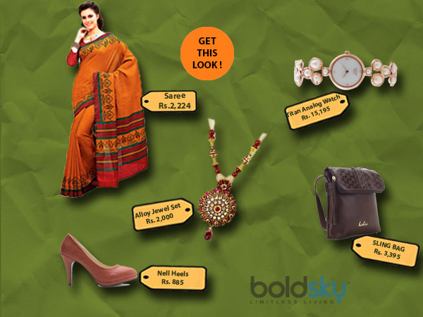 Your bride-to-be can be gifted something special this Karva Chauth. This heavily printed silk saree can be teamed up with a lot of accessories for the festival. Those are Nell heels to give you a boost look, Aamoye Alloy jewel set to add in more beauty, a brown sling bag and a stone studded Raga watch.