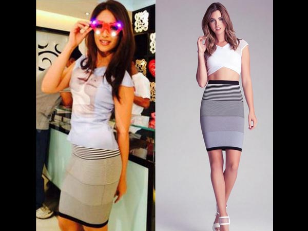 The actress donned a pretty casual yet stylish look. Ileana D'Cruz wore a high waist printed pencil skirt by Bebe. She wore the chic pencil skirt with a printed tee. The striped body con pencil skirt fit Ileana D'Cruz's figure perfectly and flaunted her curves.