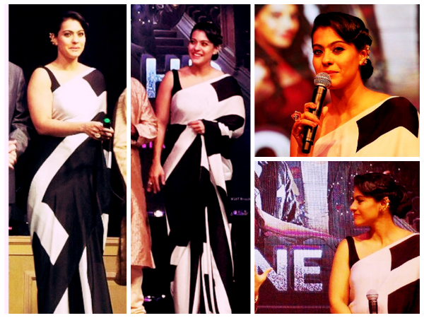 Kajol's saree was crafted in a monochrome combination of black and white that looked striking.