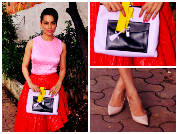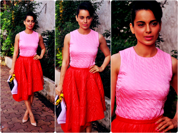 The top was a delicate pastel pink in colour. The sleeveless tank top also has a leathery shine to it. Kangana wore her favourite nude coloured pumps with this ensemble. She side parted her hair and pulled it back into a neat bun.