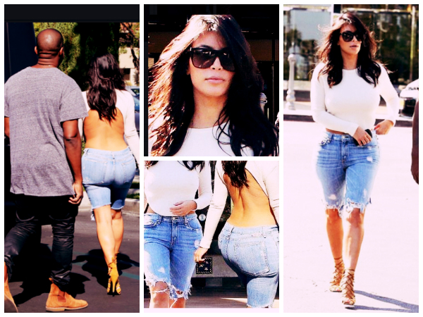 When we spotted her the last time, we saw this beauty going casual and sexy. Wearing a pair of denim knee length bermudas, she paired it up with a white backless top. The sensual part of her look was the way she confidently carried this revealing style. The denim bermudas were of knee length and ripped. There were multiple strings hanging around the hemline which looked ugly but Kim carried it off to perfection.