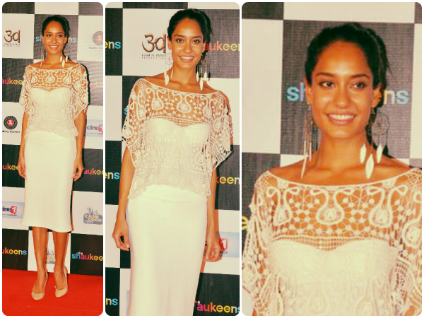 Lisa Haydon was in white dress with sheer details. The dress was a white tube number of midi length. It fit Lisa without a single wrinkle. What made the look interesting was the lace overlay on the dress. There was sheer overlay over the neckline of the dress that came up to the bust. This overlay was made of fine quality lace.