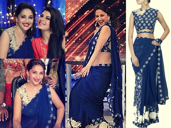 During the shooting of Jhalak Dikhla Jaa 7, Madhuri Dixit was with the team of the upcoming movie 'Kick'. She looked stunning in this cobalt blue saree that had prints on the pleats and the pallu. This type of saree is usually referred to as the 'patli pallu' saree. The fabric used in the saree was georgette. The prints on the saree were embellished with sequins.