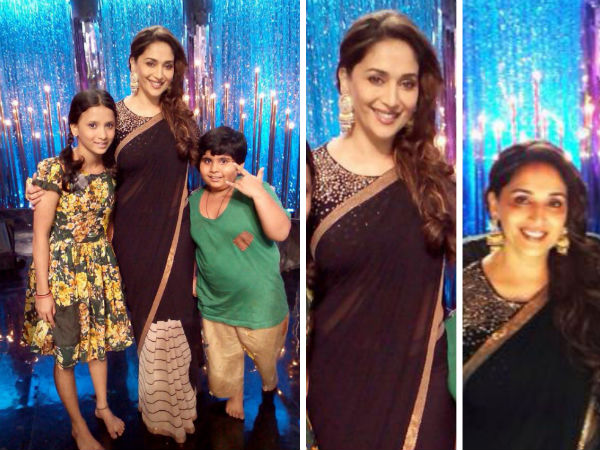 This week, Madhuri Dixit was in Jhalak Dikhhla Jaa giving us the 'jhalak' of two really different looks. As usual, she went for one western and one Indian look. She wore a red Zara pant suit for the first episode. For the later shoot, Madhuri Dixit was in a black saree. This saree was a welcome change from the type of outfits that she has been wearing lately.