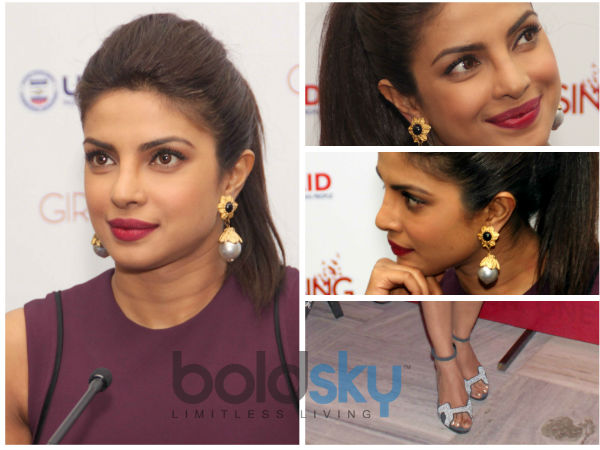 Priyanka Chopra finished her sheath attire with customary diamond studded pumps of black and silver from Hermès. Her hair was pulled back into a ponytail and her lips were filled with a bright red shade!