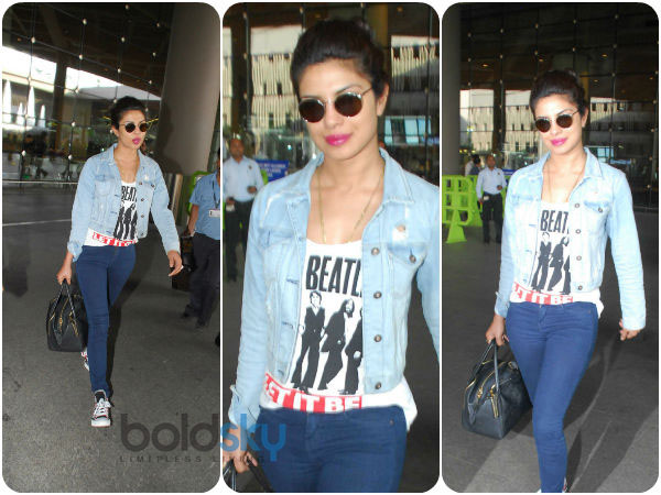 As soon as the camera got sight of Priyanka Chopra at the airport, fans rushed to see the starlet. The denim jacket from GUESS and skinny blue jeans enhanced her trim figure. The colour combination of her outfit was so spectacular it raised eyebrows. Her makeup was loud and it didn't go well with her casual appearance. Bright neon pink lips and a pair of Gandhi sunglasses wrapped her complete airport style.