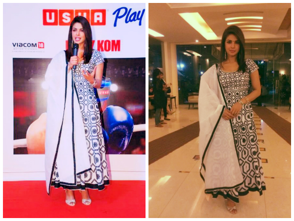 After attending the Priyadarshini Global Awards in a bright pink sari, Priyanka Chopra picked a monochrome coloured anarkali for a recent Usha event. As usual, Piggy Chops rocked both the looks.