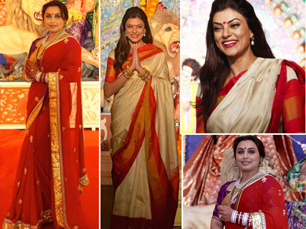 The festive season is on and we are all in the mood to dress up. But from where do we get our inspiration to get all dolled up for Durga Puja or Navratri? It is from the celebrities who are spotted during Durga Puja celebrations. We all know that many of our B'Town celebrities are Bengalis and visit the pandals during Navratri. Yesterday, we spotted Rani Mukerji in a red saree in one of the Mumbai Pandals.