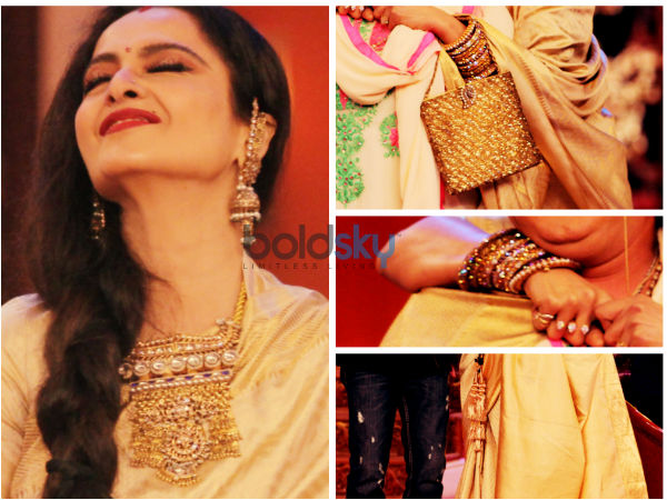 Looking sensational in a Kancheepuram silk saree, Rekha carried this look to perfection. The creamish golden saree she wore was tremendously beautiful. She wrapped her fine figure with this 9 metres of silk and posed for the camera stylishly.