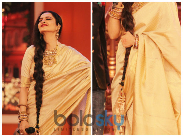 A paranda attached to the end of her long braid was something unexpected. Rekha's hair was thin and jet black. It added oomph to her natural beauty on the sets of 'Comedy Nights With Kapil'.