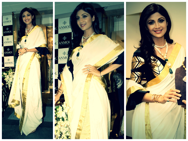 Shilpa Shetty gave us an unusual look yesterday. Normally, we see her in dazzling chiffons and Georgettes. But she gave us a traditional look at the Anmol Jeweller's event yesterday. Shilpa Shetty was dressed in a Masaba saree that looked like a typical Kasuva saree from Kerala. The white and gold drape looked like a very traditional saree.