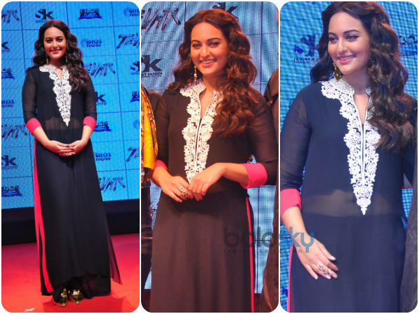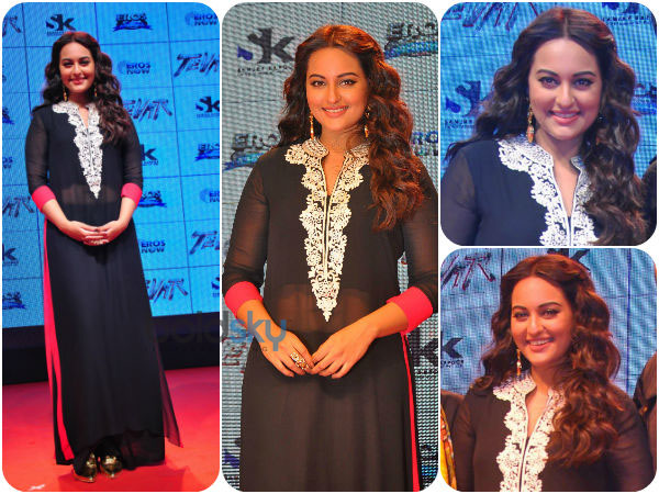 This black sheer Manish Malhotra suit was paired up with a black silk patiala. She wore golden footwear and it was way too loud for this kind of attire. At the 'Tevar' trailer launch, Sonakshi Sinha drew attention towards her rosy lips and curly hair. Her big earrings and finger cuff completed this cute style.