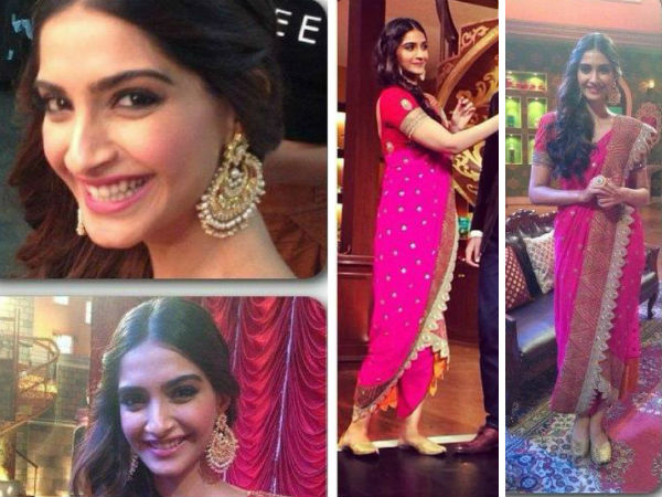 We saw Sonam Kapoor on the sets of Comedy Nights With Kapil having a gala time with co-star Fawad. Her saree was draped like a dhoti between her legs. The pink saree had a thick bandini border that was layered with golden zari frills. There were also golden dots embroidered into the saree. She draped with saree over a short sleeved blouse with a dori at the back.