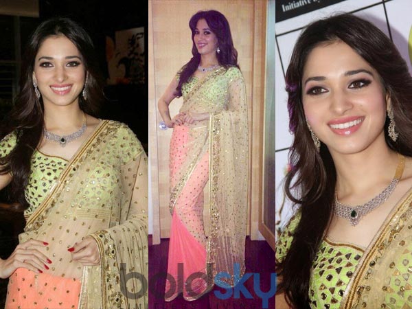 Tamannaah wore a neon lime coloured sequinned mirror work detailed cap sleeve blouse which looked perfect with the dual-toned saree. Tamannaah kept the red carpet look simple. She wore the saree with a diamond necklace that featured an emerald pendant. Tamannaah wore matching chandelier earrings.