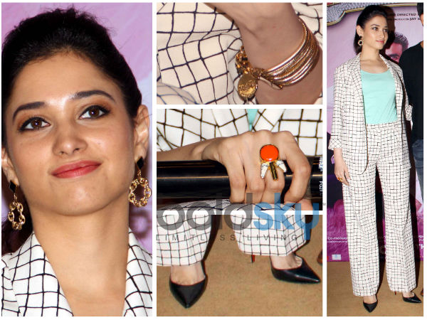 Not much of accessories were matched with this corporate style, just a couple of golden tribal bangles and an orange bling ring. Her ears weren't that heavy with jewellery either. The black and gold drops were just perfect to complete the soothing corporate style of Tamannaah's at the press conference. Black pumps and a messy ponytail gave in that trendy look.